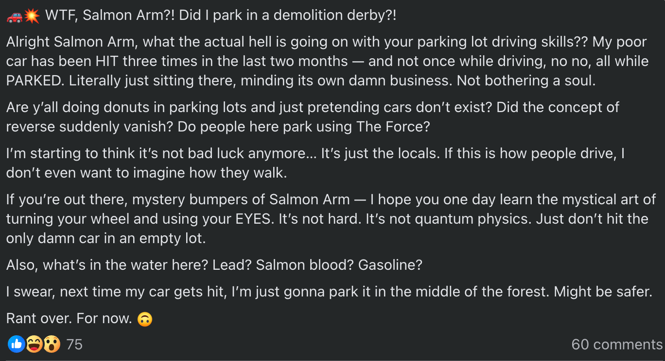 One frustrated driver took to Facebook after their car was hit three times in just two months, all while parked. Not on the highway, not weaving through town, but sitting still like a polite citizen. “Do people here park using The Force?” they asked. “Is there lead in the water? Salmon blood? Gasoline?” By the end of the rant, they said it might actually be safer to park in the forest.