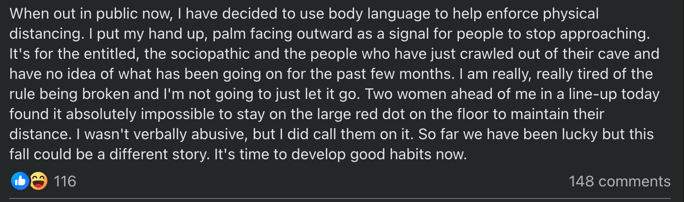 The story began with two women in line who apparently found it impossible to stay on the giant red dots on the floor. The poster didn’t yell, but she did “call them on it,” warning everyone that bad habits now would spell disaster come fall. She compared distancing to not spitting on sidewalks, not drunk driving, and not smoking indoors... essentially, COVID etiquette as the new Ten Commandments.